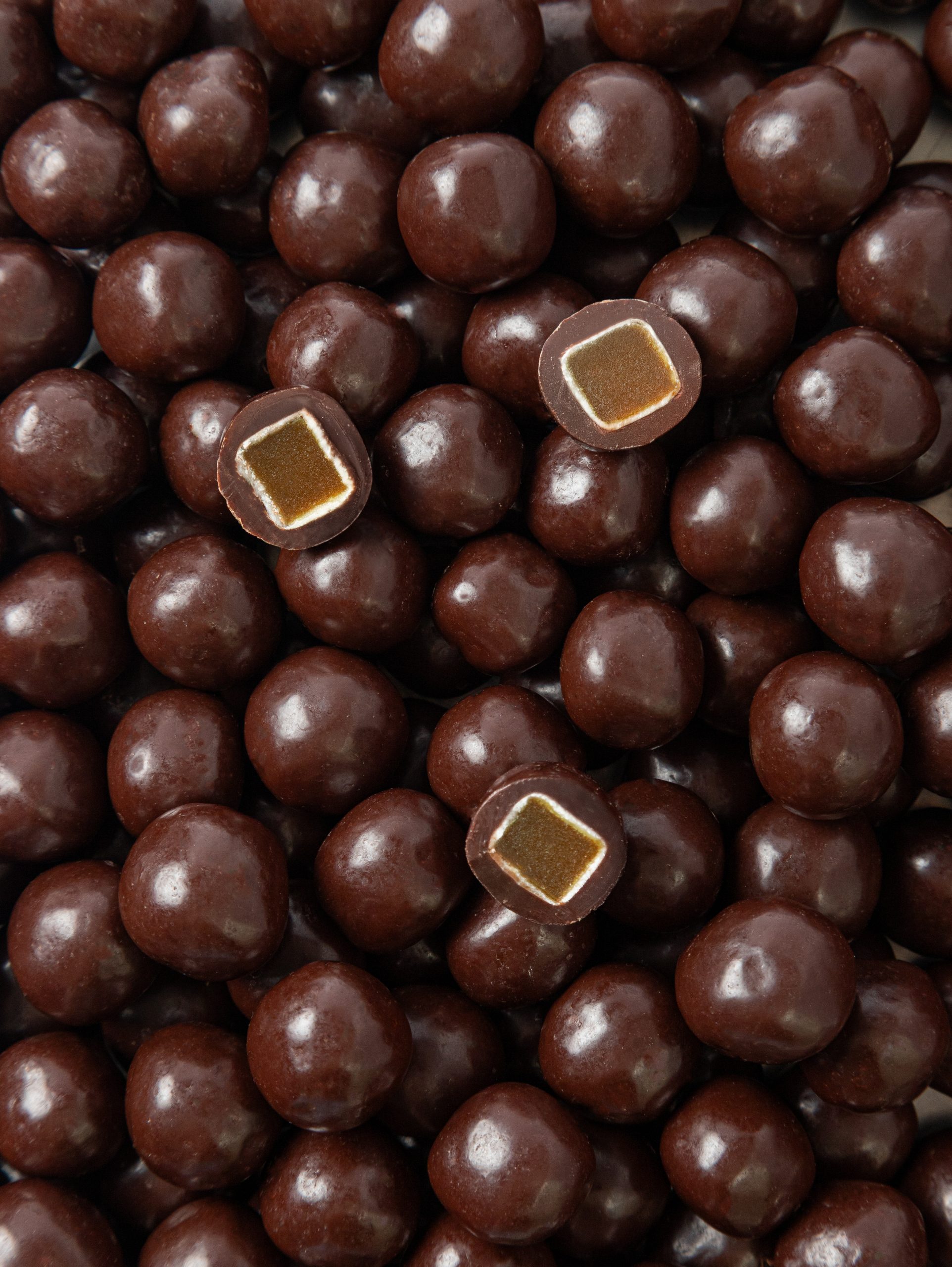 Confitado de chocolate amargo con corazón de naranja, de perfil intenso y bien definido.